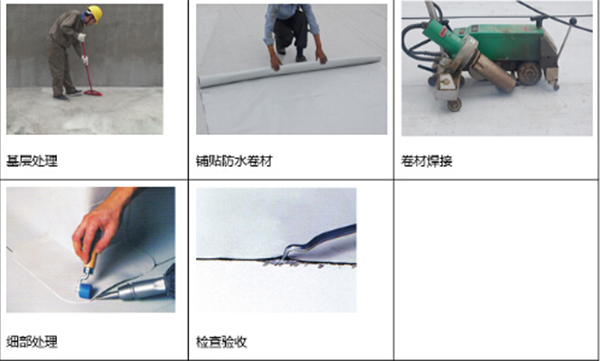 基層清理——鋪貼防水卷材——卷材焊接 ——細(xì)部處理—— 組織驗收
